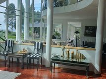 Bright swimming pool area with sea and garden views. The swimming pool (10.5 x 3.5m) has a counter-current machine. Three beautiful fireplaces, one in the living room upstairs, the other in the pool area, and the third in the spacious living area downstairs. Total floor area 496 m2.