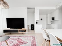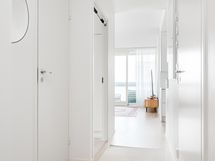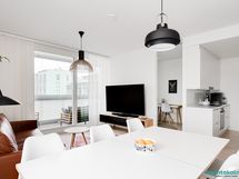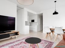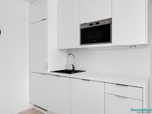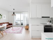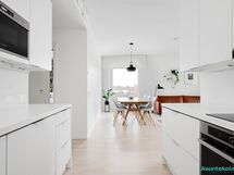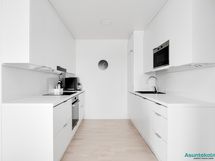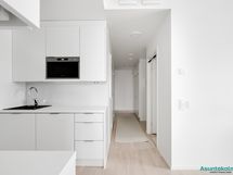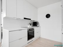 - jääkaappi/pakastin (integroitu), induktioliesi, uuni, liesituuletin, mikro (integroitu), astianpesukone (integroitu), allas. Työtasot: laminaatti.