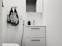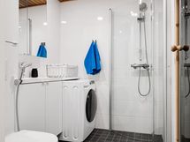 - Pesutilojen kuvaus: Suihku, suihkuseinä, peili, allas, kaapistot, pesukoneliitäntä, wc-istuin, pidee-suihku. Erillisten WC:n lukumäärä: 1. Erillisen WC:n kuvaus: Peilikaappi, allas, kaapisto, wc-istuin, pidee-suihku.