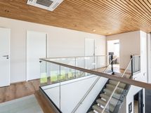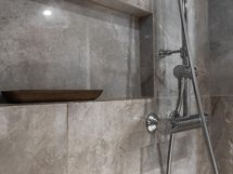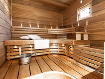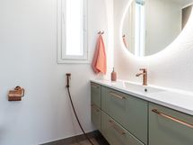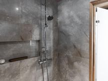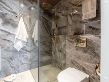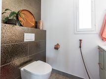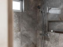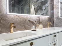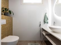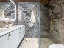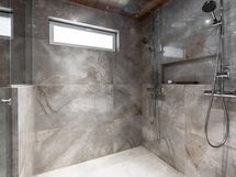 - Korkea laatuiset materiaalit mm. huomaamattomat lattia-kaivot, isoa laattaa, tarkoin suunnitellut yksityiskohdat. Kylpyhuone sekä ala-, että yläkerrassa, suihku, peilit, pesukoneliitäntä, lattialämmitys, kylpyhuonekaapisto, kiinteät valaisimet, erillinen wc*3, sähkösauna, yläkerran kylpyhuoneessa tupla-allas (Silestone) ja Hietakarin lasiseinät sekä kullatut hanat.