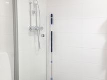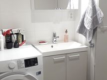 Suihku, Suihkuseinä, Pesukonevalmius, Allaskaappi, Laattalattia, Laattaseinä, Lattialämmitys