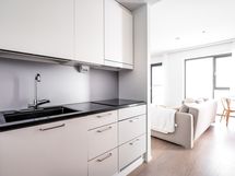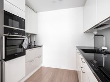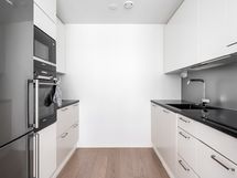 - Työtasot: kivi. Integroidut kodinkoneet: induktioliesitaso, erillisuuni, jää-/pakastinkaappi, mikro, astianpesukone, kaapistot ja kivitasot.