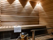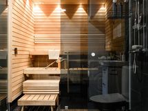- Tilava sauna, jossa on tunnelmalliset kuituvalot ja tornikiuas etäohjauksella.