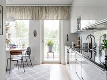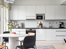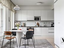- Raikkaan valkoinen keittiö hurmaa korkeakiiltoisilla kaapistoilla ja integroiduilla kodinkoneilla. Varusteluun kuuluvat jääkaappi, pakastinkaappi, induktioliesi, erillisuuni, mikroaaltouuni sekä tyylikäs kivitaso. Keittiö tarjoaa runsaasti kaappi- ja laskutilaa arjen tarpeisiin. Lattia on parkettia.