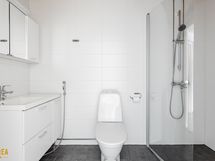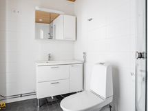 Pesutilojen varusteet: WC-istuin, suihku, lattialämmitys, allaskaappi, peilikaappi, peili, pesukoneliitäntä ja suihkuseinä.