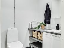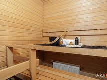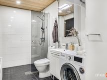 Sauna, sähkökiuas, kylpyhuone, erillinen wc, suihku, suihkuseinä, peilikaappi, kaapit, allaskaappi, pesukoneliitäntä, lattialämmitys, kiinteät valaisimet.