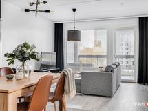 Tämä kulmahuoneisto on täydellinen valinta kaupunkiasumista arvostavalle. Moderni kerrostalokoti tarjoaa avarat ja valoisat tilat, joissa on otettu huomioon mukavuus ja käytännöllisyys. Olohuoneen ikkunat ja lasitettu parveke avautuvat länteen, tuoden luonnonvaloa ja tarjoten paikan rentoutumiselle. Keittiö yhdistyy saumattomasti olohuoneeseen, muodostaen tilan, joka kutsuu yhteisiin hetkiin perheen tai ystävien kesken. Kaksi makuuhuonetta pohjoiseen suuntautuvilla ikkunoilla tarjoavat rauhalliset tilat levolle, ja vaatehuone tuo kaivattua säilytystilaa. Kaksi vessaa ja paikka pyykkihuollolle lisää arjen sujuvuutta. Asunnon kanssa on mahdollista ostaa erillisellä osakesarjalla myytävä autopaikka.
