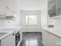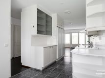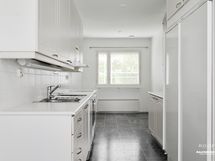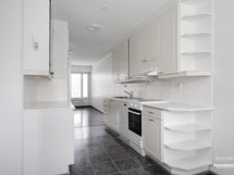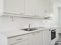 - Jääkaappi, pakastin, liesi, liesituuletin, astianpesukone, uuni. Työtasot: laminaatti.