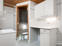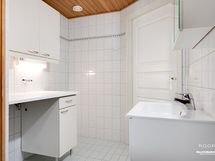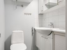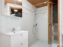 - Pesutilojen kuvaus: Suihku, peilikaappi, allas, kaapistot, pesukoneliitäntä. Erillisten WC:n lukumäärä: 1. Erillisen WC:n kuvaus: Peilikaappi, allas, kaapisto, wc-istuin, pidee-suihku.