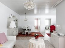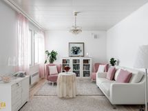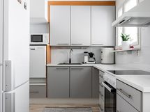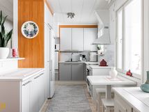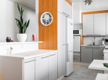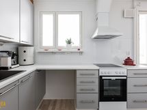 - Keittiön varusteet: Jääkaappipakastin, astianpesukone, liesituuletin, liesi ja uuni. Liesi: Keraaminen liesi. Työtason materiaali: Laminaatti. Vaaleansävyinen keittiö on siistissä kunnossa. Keittiö uusittu 2004. Tasot uusittu 2020. Kodinkoneet: liesi (2018), jääkaappi/pakastin (2018), astianpesukone, liesituuletin. Hyvin kaapisto ja tasotilaa. Lattiassa saarniparketti, Seinät maalattu, katossa sisustuslevy.