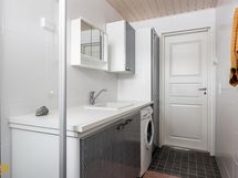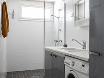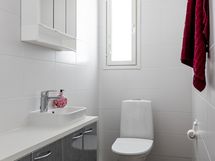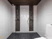 - Pesutilojen varusteet: WC-istuin, suihku, suihkuseinä, pesukoneliitäntä, peilikaappi, pesuallas, allaskaappi ja lattialämmitys. Pesutilojen kuvaus: Kylpyhuone ja sauna on erillisessä siivessä. Todella siisti ja tyylikäs kokonaisuus. Kylpyhuoneessa on kaksi suihkua, wc-istuin ja allas kaapistoineen. Vesieristetty ja lattialämmitys. Erillisten WC:n lukumäärä: 2. Erillisen WC:n varusteet: WC-istuin, bidee-suihku, pesuallas, allaskaappi ja lattialämmitys. Erillisen WC:n kuvaus: Erillinen wc. Saunaosastolla talon toinen wc-tila.