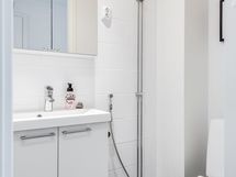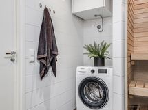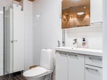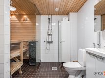 - Sauna, sähkökiuas, kylpyhuone, erillinen wc, suihku, suihkuseinä, peilikaappi, kaapit, allaskaappi, pesukoneliitäntä, lattialämmitys, kiinteät valaisimet.