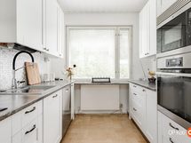 - Jääkaappipakastin, erillisuuni, induktioliesi, liesituuletin, mikroaaltouuni, astianpesukone, kaapistot, kiinteät valaisimet.