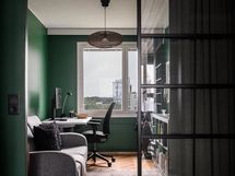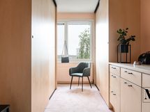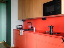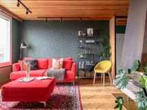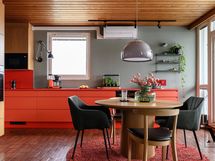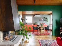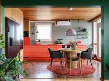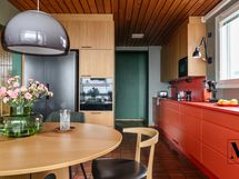 - Tämä keittiö on todellinen katseenvangitsija! Värikäs ja rohkea, mutta samalla toimiva ja nykypäivän tarpeisiin suunniteltu. Seitsemänkymmentäluvun värimaailma kohtaa modernin varustelun: side by side -jääkaappi-pakastin, integroidut kodinkoneet: induktioliesu johon integroituna liesituuletin, astianpesukone, mikroaaltouuni ja viinikaappi. Lattiassa alkuperäinen laattalattia.