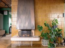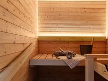 - Saunan lauteiden ja seinien puupinnat on käsitelty ja kiuas on uusittu. Tunnelmaa täydentää kaunis yksityiskohta: saunan alkuperäinen puuovi koristeellisella lasilla.