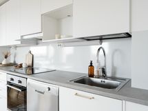 - Vaalean sävyinen avokeittiö missä mukavasti kaapistoja, sekä laskutilaa. Varustus: jääkaappi, pakastin, astianpesukone, erillisuuni- ja taso, induktioliesi, liesituuletin hormiin