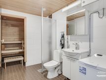 - Pesutilojen kuvaus: Suihku, suihkuseinä, peilikaappi, allas, allaskaapisto, wc-istuin, pesukoneliitäntä, bidee-suihku.