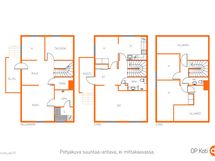 - Kiinteistörekisterin mukaan rakennuksen puolikkaan kerrosala 96 m². Rakennuspiirustuksen mukainen koko on alakerta 60m2, keskikerros 64m2 ja yläkerta 26m2. Kohdetta ei ole tarkistusmitattu.