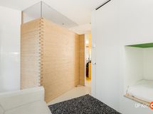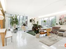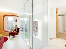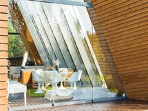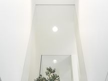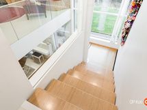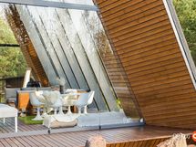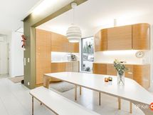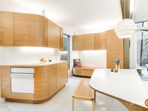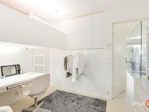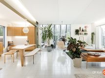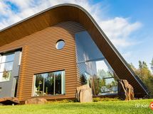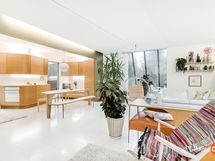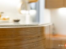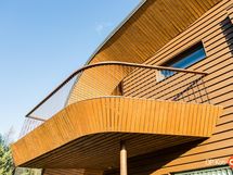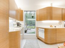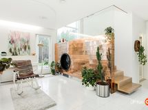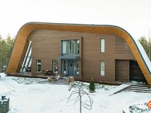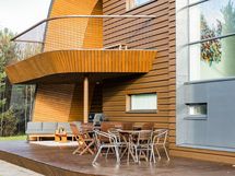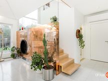 Kahteen kerrokseen sijoittuvat asuintilat ovat syntyneet rakkaudesta muotoiluun ja toimivuuteen. Kaareva katto, näyttävä kupariseinä ja yli 100 m² osin lasitettu terassi tekevät kodista arkkitehtonisen elämyksen. Puusepän valmistama massiivipuukeittiö valkobetonitasoineen on kuin veistos. Portaikko ja varaava takka yhdistävät insinööritarkkuuden ja taiteen.