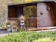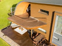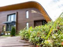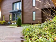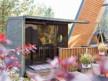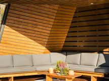 Rakennus on sijoitettu tontin korkeimmalle kohdalle kallion päälle, ja se on suunniteltu auringon kierron mukaan. Aamuaurinko valaisee keittiön, kun taas ilta-aurinko hellii parveketta ja paljuun johtavaa terassia. Helppohoitoinen pihapiiri on oma universuminsa, jossa on asfalttipiha lasten leikkeihin, maahan upotettu trampoliini, katettu grillinurkkaus ja robottiruohonleikkuri. Omenapuut ja marjapensaat tuovat satoa, ja pihametsikkö antaa suojaa. Autot saat suojaan kahden katoksen alle, joiden yhteydessä on lämmin varasto, työhuone ja kekseliäitä säilytysratkaisuja. Leikkimökki jatkaa talon muotokieltä ja tekee pihasta lasten seikkailupaikan.
