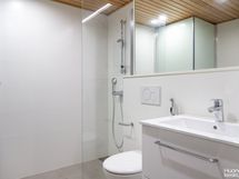 Pesutilojen varusteet: WC-istuin, suihku, suihkuseinä, pesukoneliitäntä, lattialämmitys, peili, pesuallas ja allaskaappi.