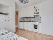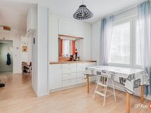 Jääkaappipakastin, lattialiesi, liesituuletin, astianpesukone, kaapistot, kiinteät valaisimet.
