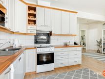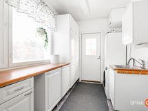 - Jääkaappi, pakastekaappi, keraaminen liesi, liesituuletin, astianpesukone, kaapistot, kiinteät valaisimet työvalot, pöytätasojen materiaali laminaatti. Keittiössä haudutusuuni