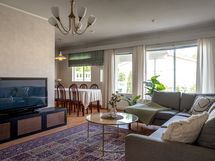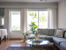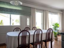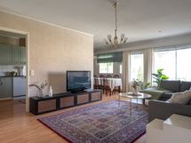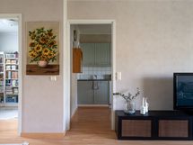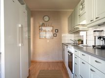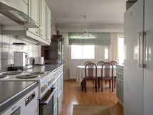 - Keittiön varusteet: Jääkaappi, erillinen pakastin ja astianpesukone. Liesi: Sähköhella. Työtason materiaali: Laminaatti.