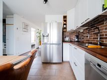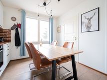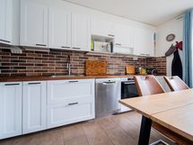 - Keittiön varusteet: Jääkaappipakastin (Jääpala-automaatti ei toimi), erillisuuni ja astianpesukone. Remontoitu 2021. Valkeat kalusteet, mukavasti kaappitilaa ja runsaasti työtasoa. Kattava kodinkoneistus. Ruokailutila ikkunan edessä.