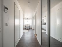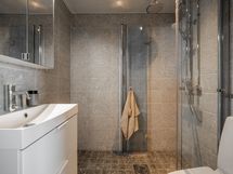 - Kylpyhuone, sadesuihku, suihkuseinät, peilikaappi, pesukoneliitäntä, lattialämmitys, kiinteät valaisimet, allaslaatikosto, wc