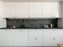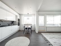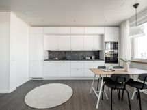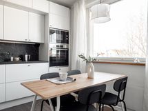 - Valkoiset kaapistot, integroidut jääkaappi/pakastin, astianpesukone ja mikroaaltouuni, erillisuuni- ja induktiotaso, liesituuletin