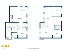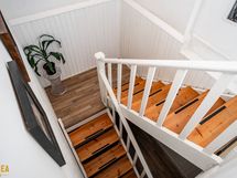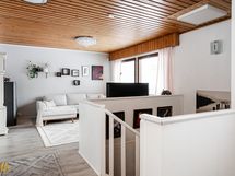 Yläkerrassa sijaitsevat keittiö, valoisa olohuone sekä kolme makuuhuonetta. Olohuoneen tunnelmaa ja lämmitystehokkuutta lisää laadukas Uunisepät Balladi -varaava takkauuni. Lisäksi yläkerrasta löytyy erillinen wc. Olohuoneesta myös käynti takapihan terassille.