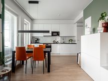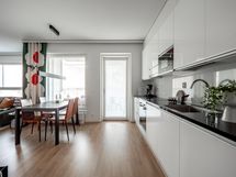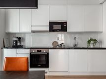 - Laadukkaat integroidut kodinkoneet: Jääkaappi, pakastin, astianpesukone, astianpesukoneliitäntä, erillisuuni- ja taso, liesikupu, kaapistot, mikro, kiinteät valaisimet. Keittiöstä on käynti parvekkeelle.