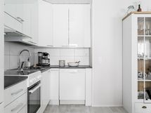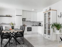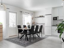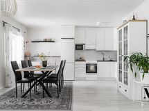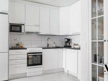- Keittiön varusteet: Jääkaappipakastin, astianpesukone, liesi, mikroaaltouuni, liesituuletin ja uuni. Liesi: Keraaminen liesi. Vaalea ja toimiva keittiö, jossa on nykyaikaiset kodinkoneet, laminaattitasot ja led-valaistus. Keittiö avautuu olohuoneeseen, mikä tekee tilasta avaran ja viihtyisän.