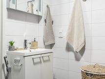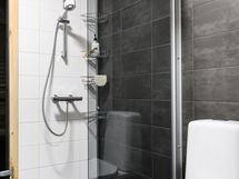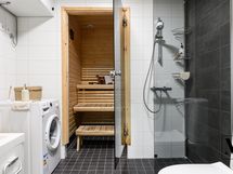 - Pesutilojen kuvaus: Tilava kylpyhuone, jossa on wc-istuin, suihku suihkuseinällä sekä peili- ja allaskaappi, pesukoneliitäntä ja lattialämmitys.