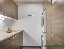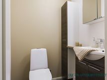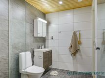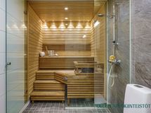 - Varusteet: WC, suihku, suihkuseinä, lattialämmitys, kiinteät valaisimet, allaskaappi, peilikaappi. Kylpyhuone ja sauna muodostavat tyylikkään ja rauhallisen kokonaisuuden, jossa arjen toimivuus ja rentoutuminen kulkevat käsi kädessä. Kylpyhuoneessa on ajattomat laattapinnat, selkeälinjainen allaskalustus sekä lasiseinällä rajattu suihkutila, joka tuo tilaan avaruutta ja hotellimaista ilmettä.