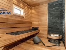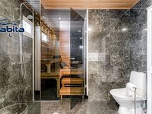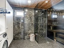 Upea kylpyhuone luo rentouttavaa spa-tunnelmaa. Kylpyhuoneesta löytyy myös kodinhoitotilaa. Sauna on varustettu pilarikiukaalla ja lasiseinällä.