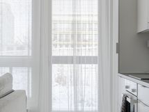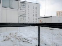 Lasitettu parveke toimii viihtyisänä lisätilana ympäri vuoden - muava paikkana aamukahville tai rauhallisiin hetkiin kaupungin sykkeen läheisyydessä.