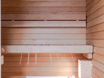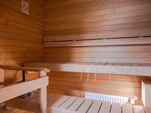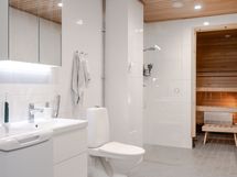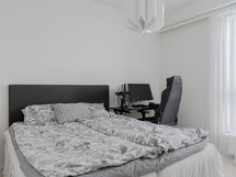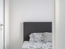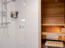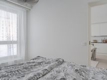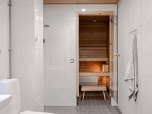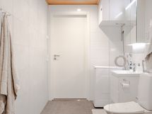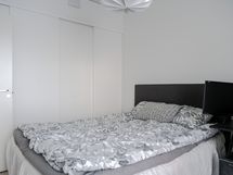 Makuuhuoneessa on käytännölliset kaapistot säilytykseen ja tilaan sopii hyvin parisänky. Kylpyhuoneessa on ajaton ja raikas ilme, lasinen suihkuseinä sekä paikka pyykinpesukoneelle. Kokonaisuus on huoliteltu ja helposti sisustettava.