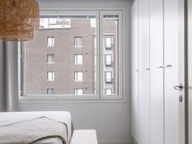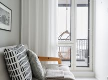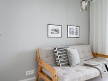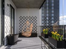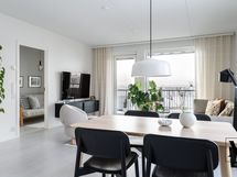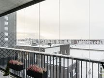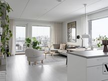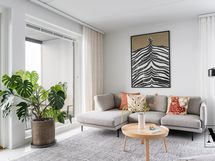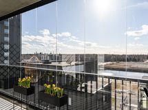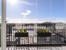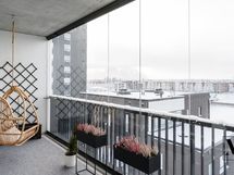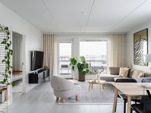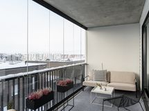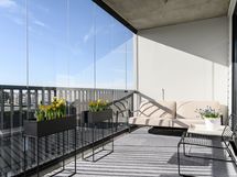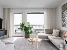 Avara olohuone jatkuu luontevasti lasitetulle parvekkeelle, joka tuo lisää tilan tuntua ja toimii viihtyisänä lisätilana arkeen.