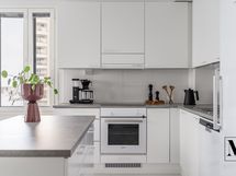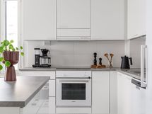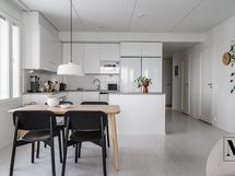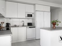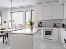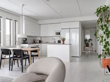 Oleskelutilat muodostavat avaran ja valoisan kokonaisuuden. Raikkaan vaalea avokeittiö on kodin sydän, jossa on runsaasti säilytystilaa ja laadukkaat kodinkoneet: täyskorkea jääkaappi ja pakastinkaappi, astianpesukone (2026), integroitu mikroaaltouuni, induktioliesi sekä erillisuuni. Käytännöllinen saareke tuo lisää työskentelytilaa ja toimii tarvittaessa myös pöytätasona, ja saarekkeen vetolaatikot tarjoavat lisäsäilytystilaa.