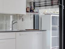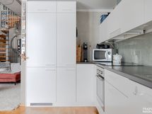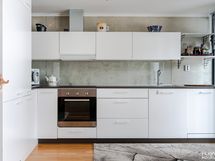 - Keittiön varusteet: Jääkaappipakastin, uuni, liesituuletin ja astianpesukone. Liesi: Keraaminen liesi. Työtason materiaali: Laminaatti.