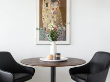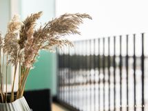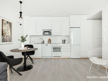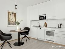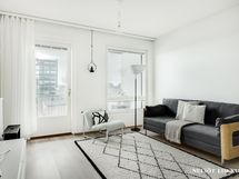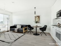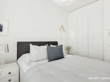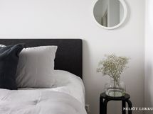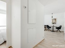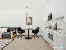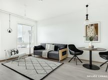 Moderni musta Möljän sillan kupeessa sijaitseva kerrostalo kätkee sisäänsä valoisan ja ajattoman kodin. Valkoinen sisustus kauniin lämpimän puunsävyisen lattian ympärillä on kuin valkoinen taulu ja se antaa vapaat kädet toteuttaa itselleen mieluisan sisustuksen.