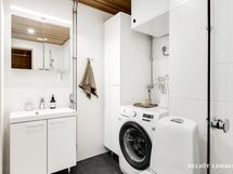 Pesutilojen kuvaus: Tummanharmaa laatta lattiassa. Valkoiset kaakelit seinissä. Suihku. Lasisuihkuseinä. Allaskaluste. Peilikaappi LED-valoilla. Wc-istuin. Bideesuihku. Pesukoneliitäntä. Pyykkikaappi.