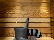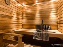 Lämminhenkinen sauna. Lämpöhaapapaneelit ja -lauteet. Sähkökiuas.