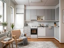 - Keittiön varusteet: Liesi, jääkaappipakastin, astianpesukone (60cm) ja liesituuletin (IV-ohjaus samassa). Liesi: Valurautaliesi. Työtason materiaali: Laminaatti.
