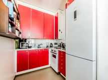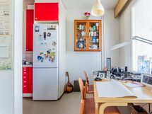 - Keittiön varusteet: Jääkaappipakastin, uuni ja liesi. Keittokomerossa alkuperäiset kaapistot punaisilla ovilla.