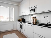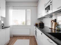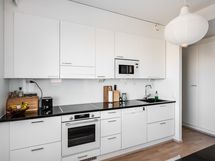 - Työtasot: kivi. Jääkaappi, pakastinkaappi, induktiotaso ja erillisuuni, integroitu mikro, astianpesukone, liesituuletin, kaapistot, kivitasot