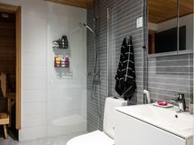 - Pesutilojen kuvaus: suihku, suihkuseinä, wc-istuin, allas, allaskaapisto.