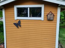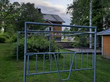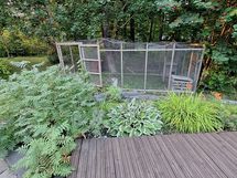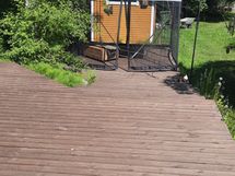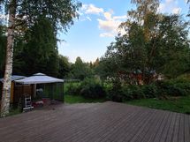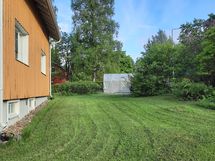 Tontilla pieni vanha liiteri, muutaman vuoden vanha kasvihuone, pressuautokatos, pyykki- ja mattoteline, talon edessä tilava patio/terassi, kissa-/koiratarha, kukkaistutuksia. Tontilla on reilusti tilaa lisärakennuksille.
